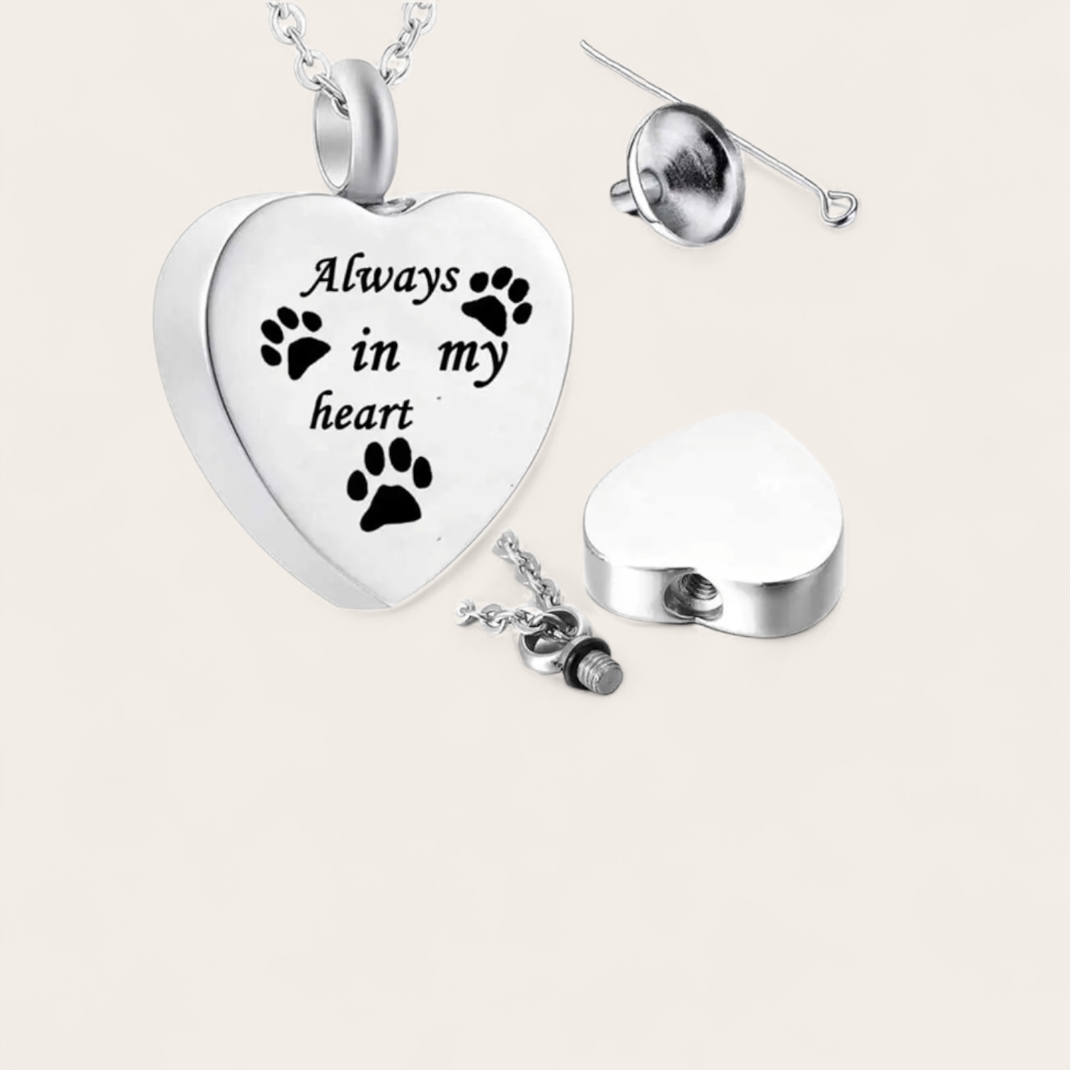 Ce bijou délicat, livré avec sa chaîne assortie, renferme un compartiment discret permettant d’y conserver quelques poils ou une petite quantité de cendres. Ainsi, vous portez contre votre cœur une part tangible de l’amour et des souvenirs partagés avec votre fidèle ami.