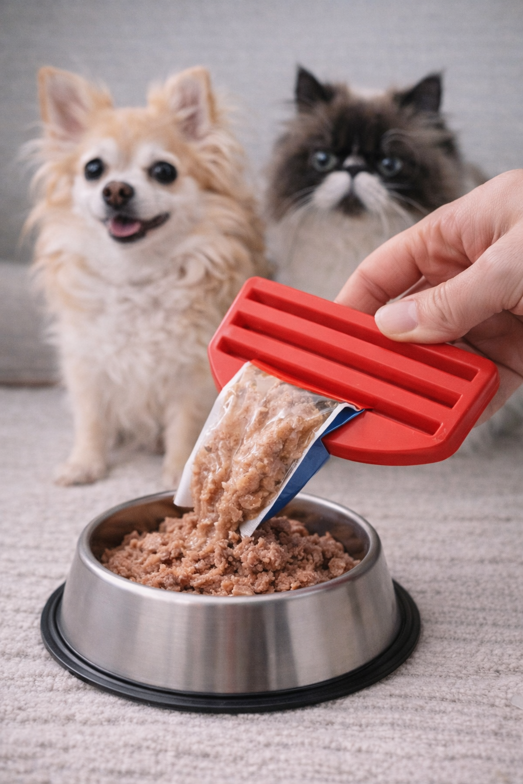 Ce presse-aliment s’adapte à la grande majorité des sachets de pâtée, pour chats comme pour chiens.